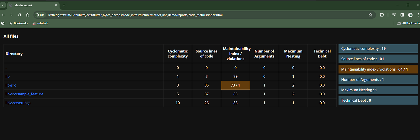 | dart run dart_code_linter:metrics analyze lib -o reports/code_metrics -r html |